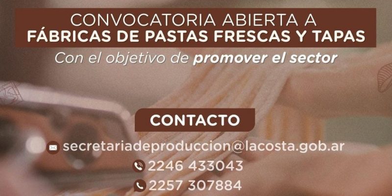 La Municipalidad de La Costa abrió una convocatoria destinada a fábricas de pastas frescas y tapas de empanadas que desarrollen su actividad en el distrito. La propuesta tiene como finalidad promover el sector y comenzar a generar espacios de organización y trabajo conjunto entre los productores locales.