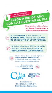 Quienes tengan deuda y se adhieran a un plan de pago podrán acceder a hasta un 40% de descuento en los intereses. Además, quienes adeuden el período 2025 y cancelen ahora esa deuda tendrán un 75% de descuento en los intereses.
